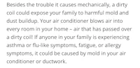 9 out of 10 system failures are caused by dirt and dust according to the Louisiana Cooperative Extension Service. One of the functions of the fan, located inside of your air handler, is to keep the heat exchanger cool. Accumulated dirt and debris can reduce the CFM (cubic feet of air per minute) by as much as 50%! This is the most common cause of cracks in heat exchangers. Having your HVAC system cleaned may prevent pre-mature breakdown & aging of your heating and cooling system.